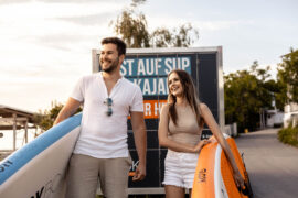 Stand-Up-Paddling und Kajakfahren auf der Neuen Donau in Wien? Das kannst du beim Stand Up Paddle Verleih Usus am Wasser erleben. Lass deinen Tag entspannt bei einer After-Work-Paddeltour ausklingen oder nutze deine Mittagspause, um auf dem Stand-Up-Paddle-Board oder Kajak dem Alltag zu entfliehen. Der Kiosk vor Ort versorgt dich mit leckeren Snacks und Getränken – Pommes meets Wasser!