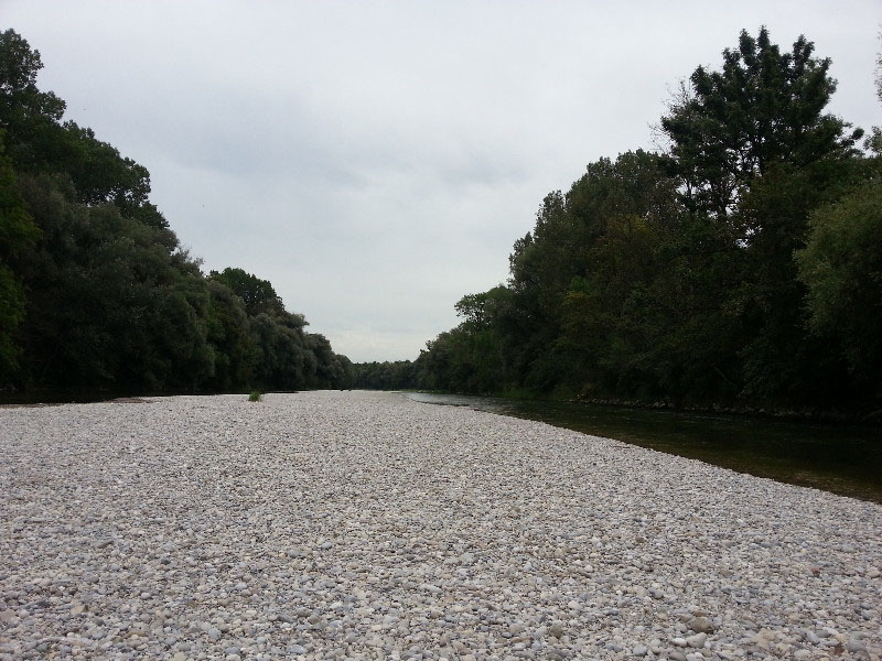 Ausstieg aus der Isar an dieser Stelle möglich. Strömung ist an manchen Stellen nicht zu unterschätzen. Sollte sie zu stark sein, um am Ufer anlegen zu können oder in die kleine Bucht kurz nach der Brücke links einfahren zu können, empfehle ich ein Anlegen an einer Kiesbank und das Durchwaten der Isar mit Board zum Ufer.