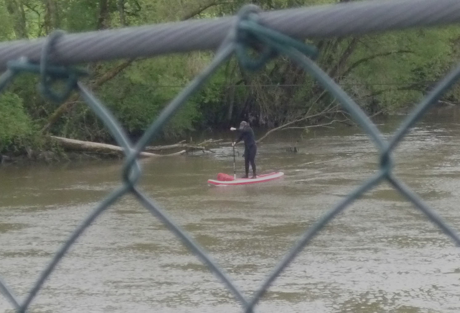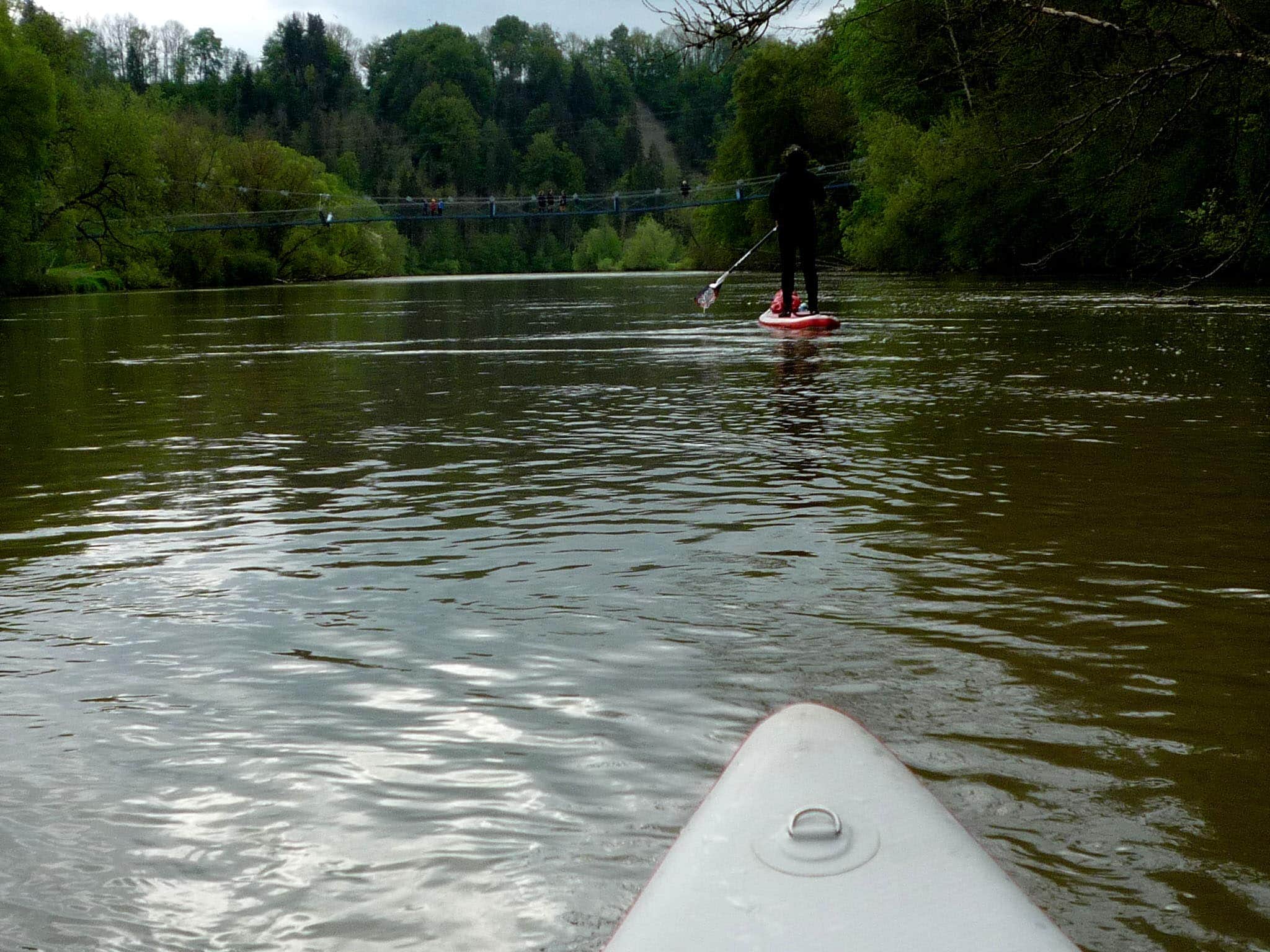 Da ich bereits ausgepowert bin, lasse ich mich nun entspannt zurücktreiben. Zeit, den Wanderern auf der Hängebrücke zu zuwinken und zu Fotografieren. Erst auf der Staustufe gilt es bei Gegenwind nochmals zu paddeln.